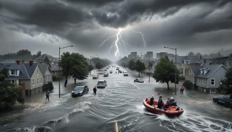 шторм, проливные дожди, наводнение в городе. Фото ИИ Кандинский
