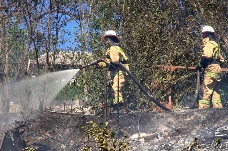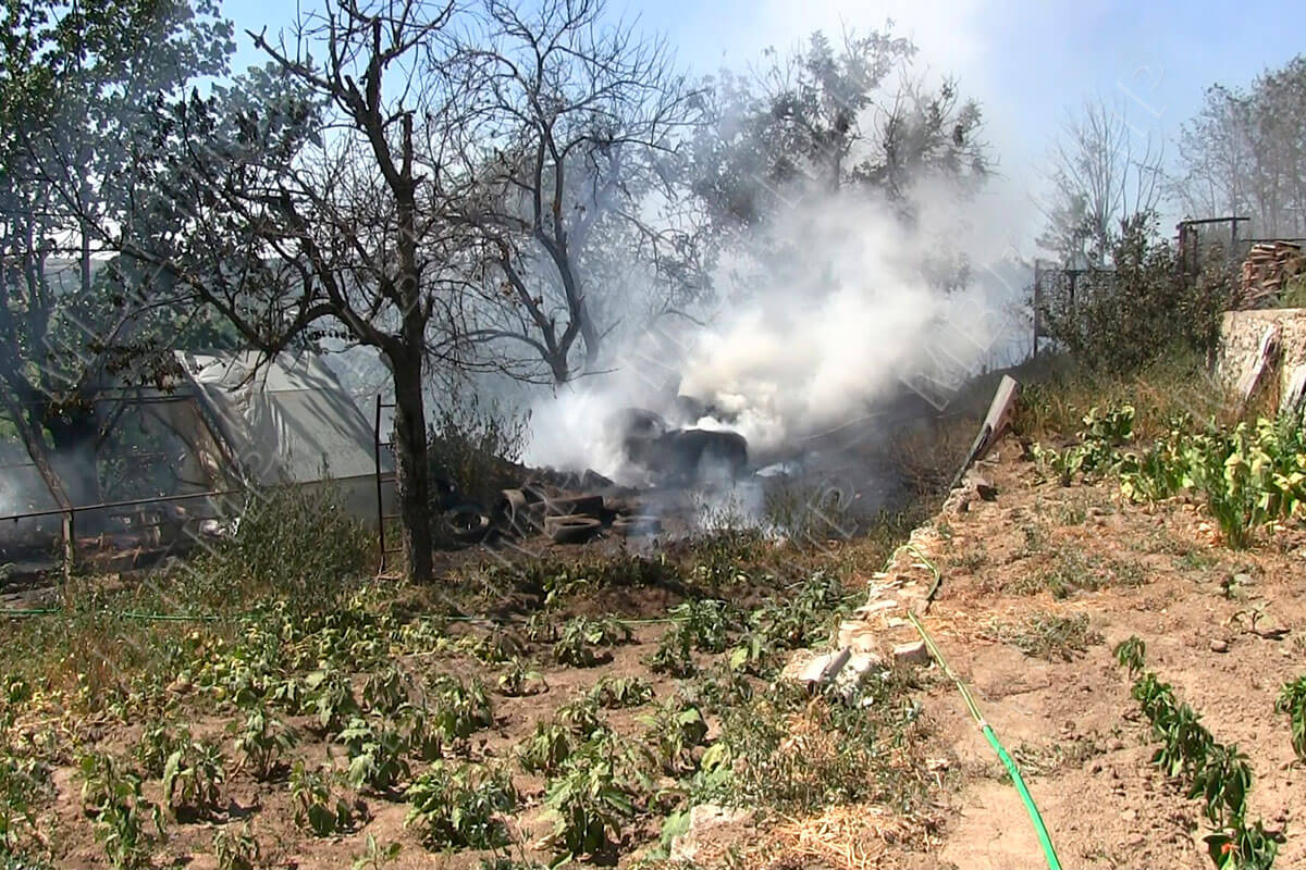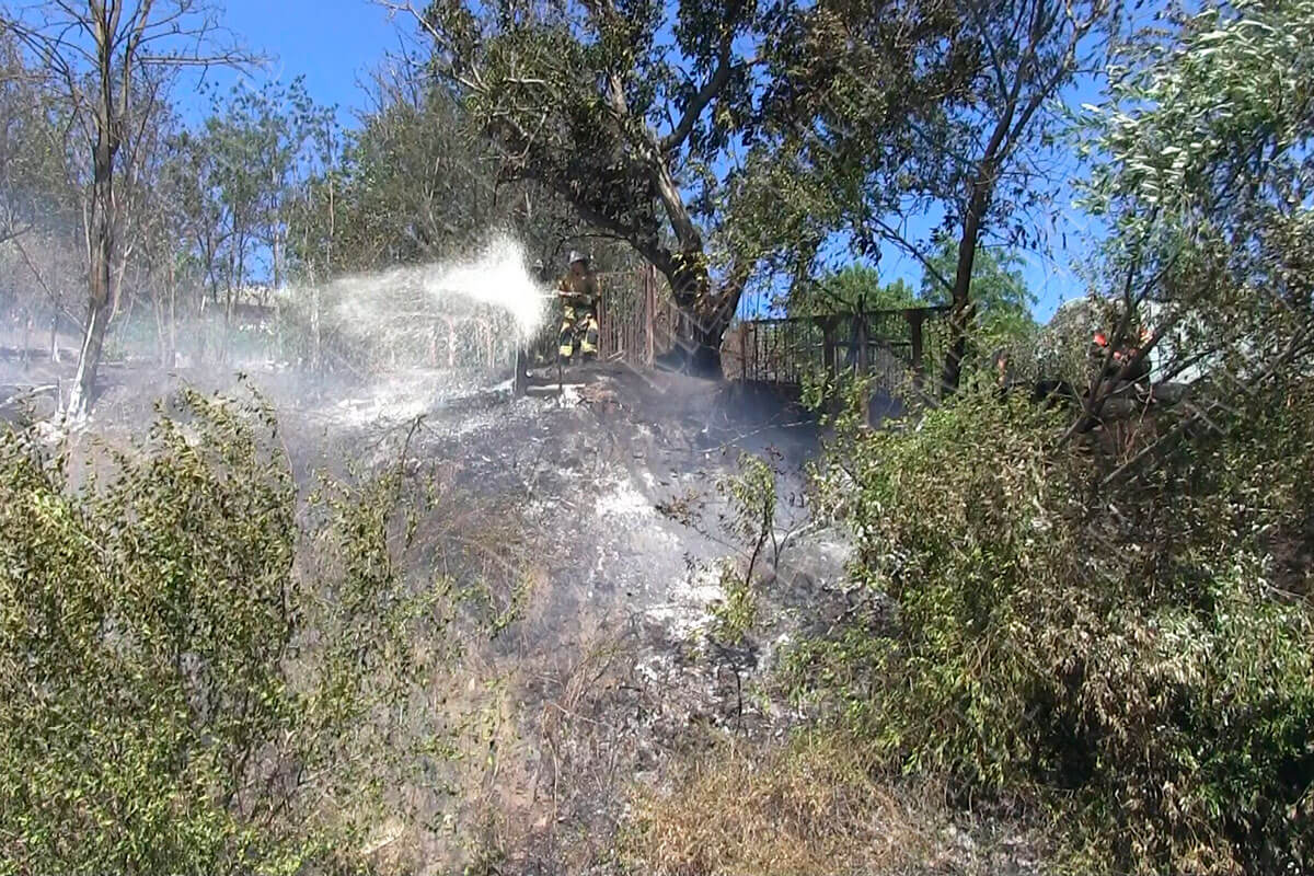 На месте специалисты увидели ещё одно опасное место – пламя полыхало прямо у жилых домов. К борьбе с огнём присоединились жильцы. Они поливали водой из шлангов тлеющий сухостой.