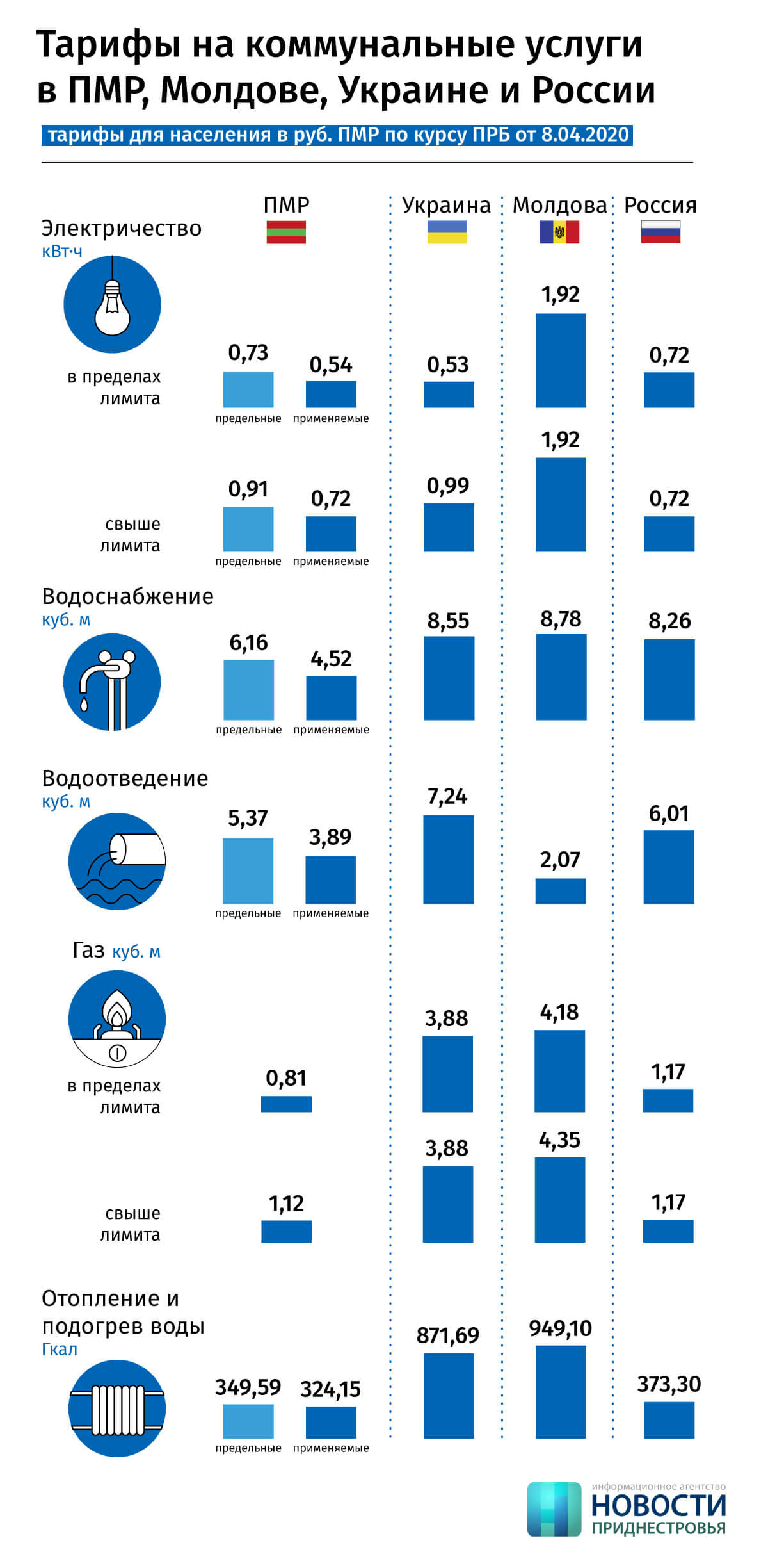 Значительной статьей расходов личного или семейного бюджета является оплата коммунальных услуг. Одной из мер поддержки в условиях пандемии коронавируса COVID-19 будет отсрочка по коммунальным платежам до 30 июня. Накопившуюся сумму долга можно будет внести равными частями до конца года. С другой стороны, если за энергоносители не платить вовсе, у энергоснабжающих предприятий не будет денег для поддержки инфраструктуры. Поэтому вносить плату необходимо. Тем более что в сравнении с соседями тарифы в Приднестровье значительно ниже.