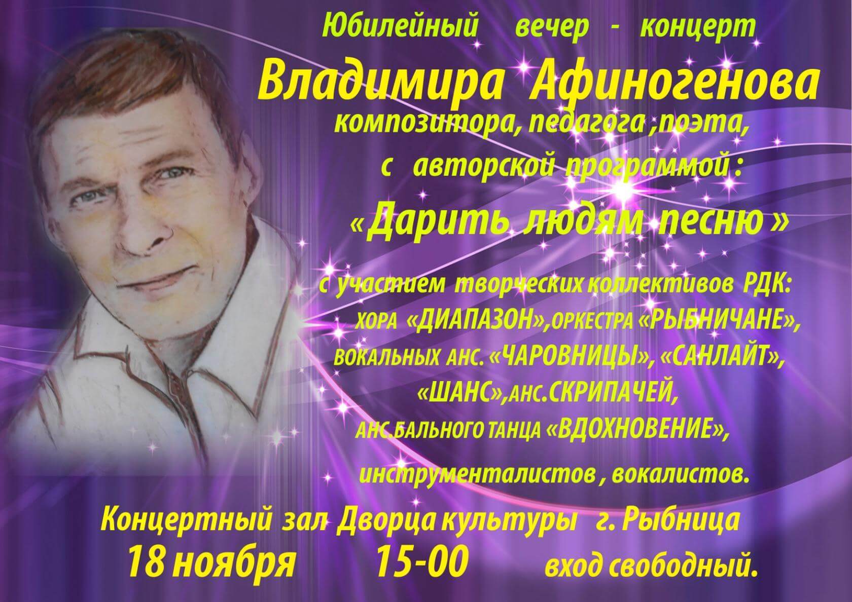 Владимир Афиногенов. Анонс концерта 18 ноября 2018г. 15.00 Дом Культуры г. Рыбница. Вход свободный.
